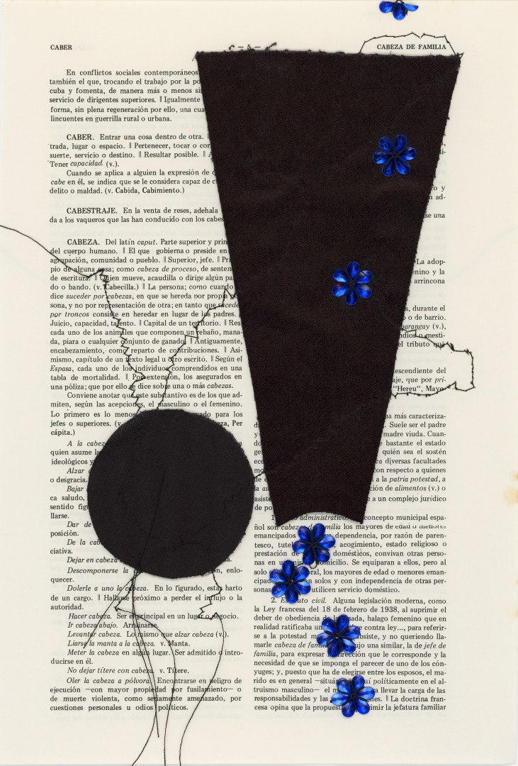 Cabeza de Familia (Head of Household) (paper, thread, fabric, beads, 7” x 10 ½“, 2013)