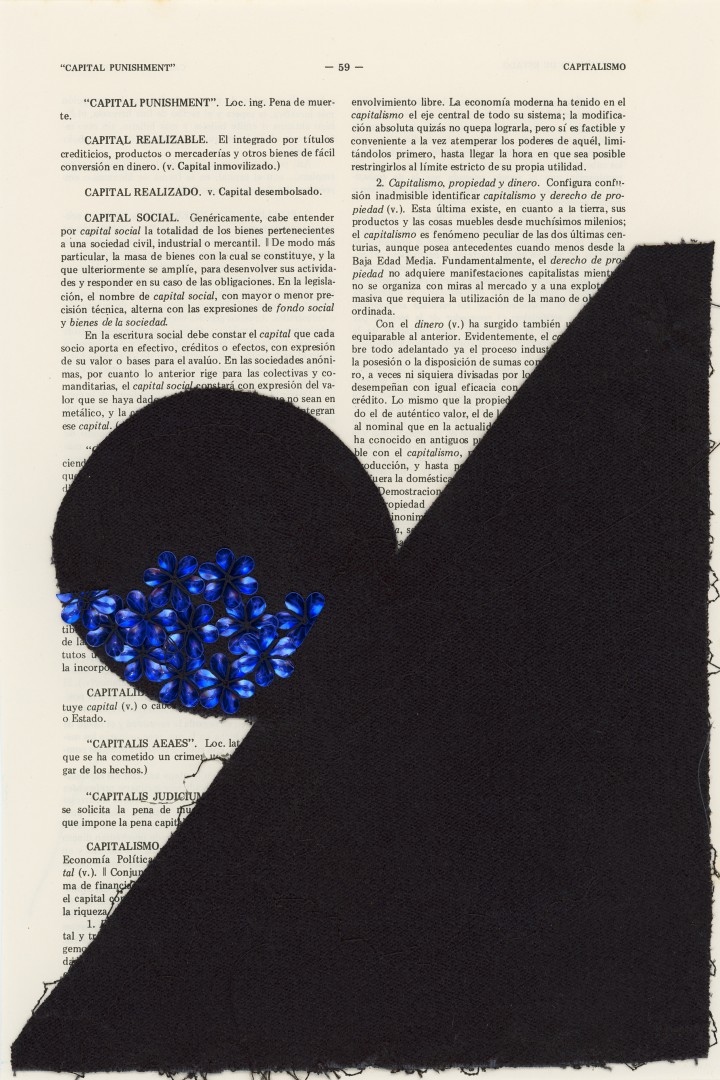 Capitalismo (Capitalism) (paper, thread, fabric, beads, 7” x 10 ½“, 2013)
